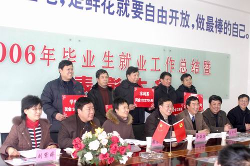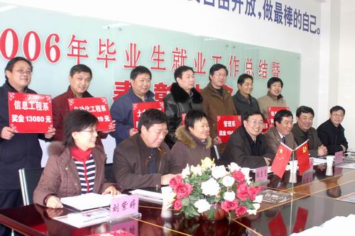2007年1月27日,我院在就业指导中心洽谈室隆重举行2006年毕业生就业工作总结表彰大会。院党委书记俞海洛,院长刘宪亮,党委副书记张惠贞,副院长孙五继、茹正波、刘紫婷出席了会议。院党委副书记、纪委书记王卫东主持会议。相关部门领导,各系主任及主管学生工作的书记、副书记参加了会议。