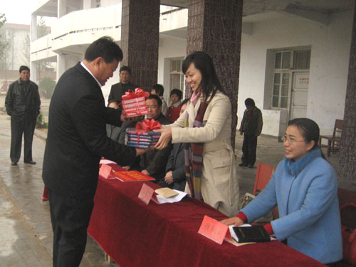 我院团委谷献晖老师在捐赠仪式上讲话。她说黄河水院的广大团员青年能有机会为范庄村希望工程献出一份爱心,这是一份光荣,此次捐赠仅仅是我院与开封县范庄村开展长期 “共建帮扶”活动的开始。我院广大青年团员将尽最大努力发挥学院的人才与技术优势,为乡亲们办实事、办好事。