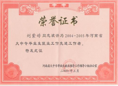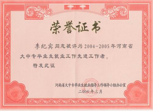 410上午,从全省大中专毕业生就业工作会议上传来喜讯,我院荣获“河南省大中专毕业生就业工作先进单位”荣誉称号,这是继2003年我院获得此项荣誉后又一次获此殊荣。会上,学生处处长刘紫婷、就业指导中心主任李纪宾荣获“河南省大中专毕业生就业工作先进工作者”,受到表彰。