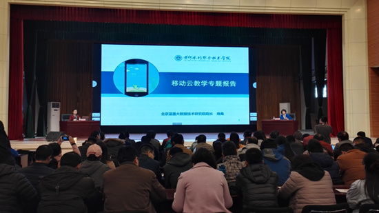 为进一步提高教师信息化教学应用能力,推进课堂教学诊改工作,2月26日下午,学校特邀北京蓝墨云教学大数据研究院院长、中国职业技术教育学会理事商桑教授来校做《云计算大数据时代智慧校园建设及课堂教学与诊改智能化》专题报告。校党委副书记、工会主席王卫东,副校长杨士恒,副校长焦爱萍等出席报告会,全校专兼职教师参会。报告会由副校长焦爱萍主持。