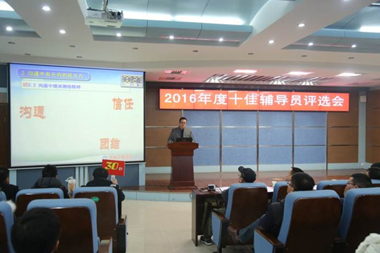 为进一步推进我校辅导员队伍专业化、职业化建设,树立先进典型,加强经验交流,12月20日下午,我校在3号实训馆学术报告厅召开2016年度“十佳辅导员”评选交流会。全体学工人员参加了会议。