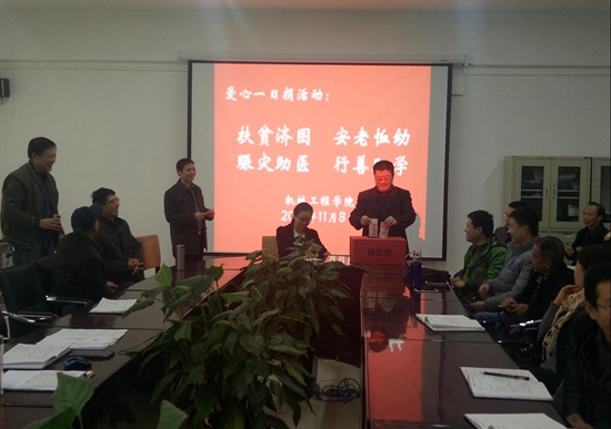 活动由校文明办统筹安排,坚持“依法组织、广泛发动、坚持自愿、鼓励奉献”的原则,提倡每人捐赠一天经济收入。各单位广泛动员、认真组织,学校各级领导干部充分发挥示范带动作用,全校900多名教职工积极响应、踊跃捐款,主动奉献爱心,共募集善款59276.5元,并于11月10日将善款捐赠到开封市慈善总会。