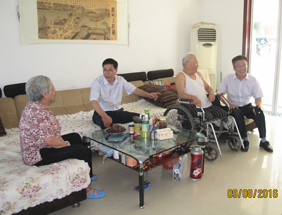 在李宝斋老师家中,看到李老师精神矍铄、身板硬朗,许书记和刘副书记非常高兴,一同坐下来和李老师及夫人愉快畅谈,为李老师多年来身残志坚、勇于面对的乐观精神而感动,希望他们保重身体,一如既往地关心、支持学校的各项工作。