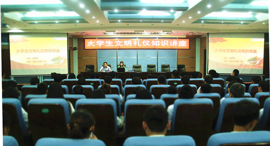 讲座开始前,学生处副处长王国英以自己的亲身经历,向学生们介绍了因部分国人不懂文明礼仪知识而发生的一些恶性事件,这些事件不仅影响了自己的形象,更影响了国家的形象。他勉励学生要遵守文明礼仪,从身边的小事做起,从一个眼神、一个动作、一句用语、一身着装等点滴做起,将文明礼仪的核心牢记于心,用文明礼仪规范自身,争做有素养的当代大学生。