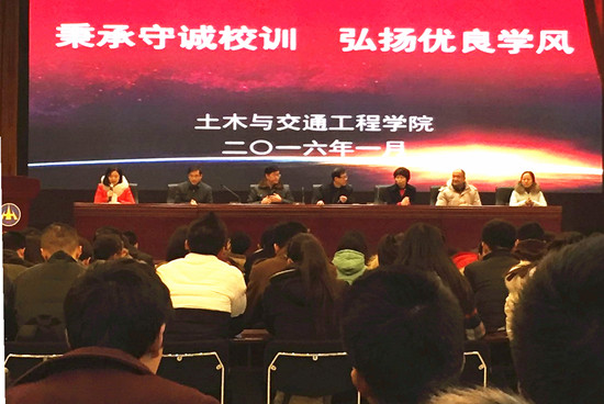 1月11日上午,土木与交通工程学院在学生活动中心召开以“秉承守诚校训,弘扬优良学风”为主题的诚信考试宣誓大会。校党委副书记、副校长王卫东出席大会并讲话。