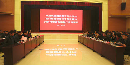 11月12日,国家教育行政学院第50期高校领导干部进修班33名学员来我校考察调研。校领导刘国际、茹正波、刘紫婷、杨士恒、张豫东、刘卫锋等热情接待了来访嘉宾。党政办、党委组织部、党委宣传部、教务处、科技处、人事处、学生处、水利工程学院、土木与交通工程学院、测绘工程学院、机械工程学院、旅游系等部门的负责人参加了座谈交流活动。