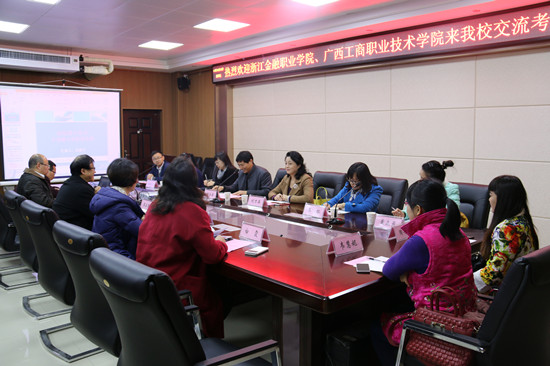 11月13日下午,浙江金融职业学院马克思主义学院院长曲士英、广西工商职业技术学院社科部主任刘万英等一行9人到我校考察交流。我校党委副书记、副校长王卫东,教务处长焦爱萍,思想政治理论教学部主任彭新立、副主任白霞及相关教师等在5号实训馆会议室热情接待了来访客人。交流会由白霞主持。