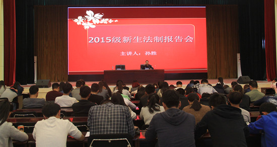 10月13日下午,我校在学生活动中心报告厅举行了2015级新生法制报告会。学校特邀开封市公安局金耀分局孙胜警官来校主讲。我校学生处工作人员、各院系辅导员及2015级新生代表等700余人聆听了报告。报告会由学生处教育管理科科长柴杉主持。