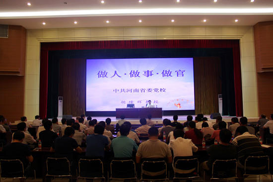 7月7日下午,中共河南省委党校校委委员、河南行政学院党组成员胡隆辉教授应邀来我校做题为“做人 做事 做官”专题报告。全校科级以上干部、基层党支部书记认真聆听了报告。报告会由副校长杨士恒主持。该专题报告会是我校暑期干部培训和“三严三实”专题教育的重要内容之一。报告中,胡教授运用诙谐幽默的语言、生动翔实的案例,深入浅出地阐述了做人、做事、做官的辩证关系,教育和警示广大干部谨守底线,堂堂正正做人,兢兢业业做事,清清白白做官。报告内涵丰富,见解独到,发人深思。