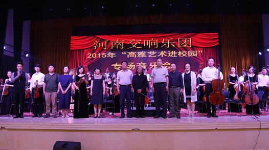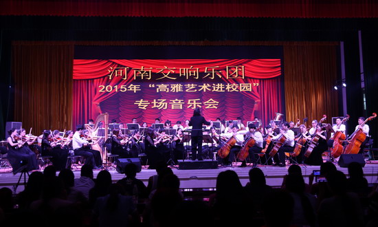 527晚上7:00,由我校艺术系(公共艺术教育教学中心)承办的河南交响乐团2015年“高雅艺术进校园”专场音乐会在我校大学生活动中心报告厅举行。校领导与全校部分师生共同观看了演出,享受了一场视听盛宴。