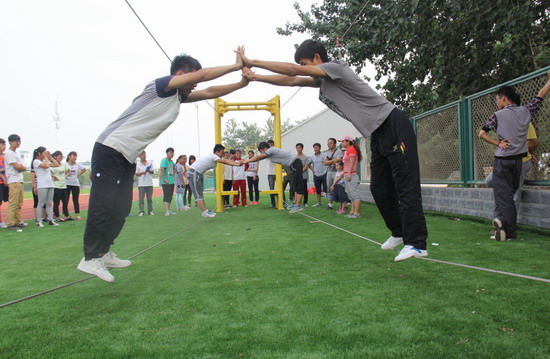 上午的活动过程中,自律会成员积极主动、斗志昂扬。“破冰”游戏中,大家在培训教练的引导下,进行了“握手123”和“兔子舞”两个小游戏,调动了现场的气氛;全体成员又分成4组进行了“群龙取水”、“重走人生路”和“盲人方阵”等训练项目,让大家体会团队积极沟通、默契合作、协调一致的重要性;下午,在分组完成“硫酸池”和“共同进步”两个项目后,全体成员相互协作,成功翻越了4米高的“毕业墙”,共同完成了本次训练中难度最高的项目,圆满完成了训练任务。活动持续一整天,虽然参训成员非常累,但大家的情绪异常高涨。