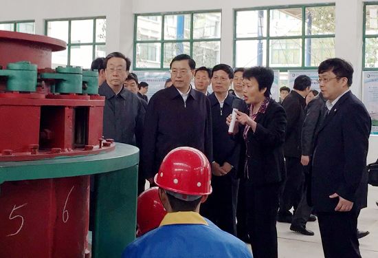 张德江听我校党委书记张惠贞介绍径向式水轮机导水机构实训装置