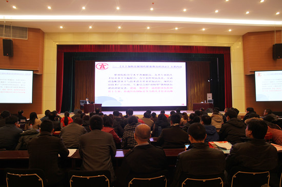12月19日下午,教育部职成司农村教育处刘杰处长应邀到我院做《大力推进涉农职业教育改革发展,加快构建现代职业教育体系》专题报告。我院所有在校的院领导出席了报告会,各系部领导、教研室主任、专业带头人及全国水利职业院校骨干教师师资培训班的所有学员聆听了报告。报告会由学院党委副书记、副院长王卫东主持。