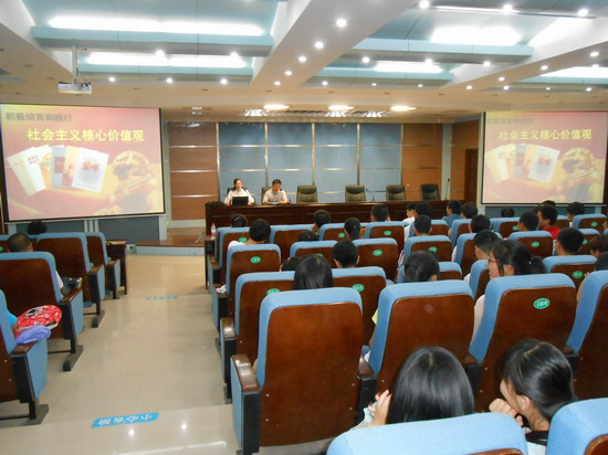 讲座中,赵俊亚从社会主义核心价值观与资本主义核心价值观的对比讲起,分析了我国目前价值观的现状,对十八大报告提出的社会主义核心价值观“三个倡导”共24个字内容进行了详细解读,并通过对孙影、刘丽等道德模范事迹的讲述,让学生们领悟到社会主义核心价值观的内涵和要求,深刻理解了种种社会现象的本质,消解了种种人生认知困惑。