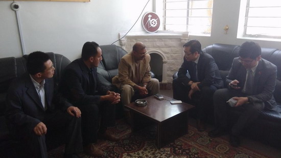 4月15日上午10:00(也门萨那时间),中国驻也门使馆赵参赞一行来到也中科技学院,在校长亚辛的陪同下看望慰问了在该校支教的的4位中国教师(包括我院支教教师孙玉龙、李向),召开了座谈会。