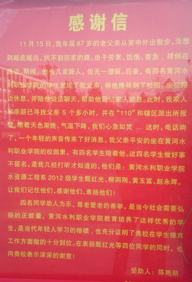 我院90后大学生的举动感动了老人一家。11月24日,老人的女儿陈女士将一封感谢信送到了水资源工程系学工办,表扬4名学生助人为乐、不求回报的高尚行为。