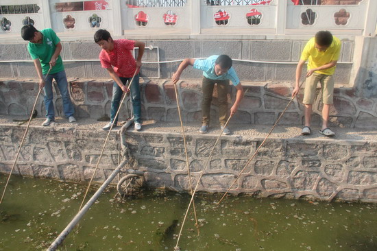 9月1日下午,院学生会组织学生们打捞学校大门外水池里的垃圾,清理水草,院社团联合部的青年志愿者们动手将教学楼和宿舍楼下凌乱堆放的自行车摆放整齐。