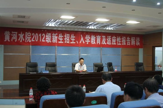 周凌波副院长首先对我院2013级新生招生录取工作取得的成绩表示祝贺,介绍了全国范围内高校生源下降、导致生源竞争日益激烈的原因,强调了招生工作、入学教育以及新生适应性的重要性。他从招生调查、招生分析指标体系、入学教育评价及期待、新生适应性分析、品牌识别、招生宣传语、精准广告投放、招生手册、网络宣传、招生专网、电话咨询、现场咨询、校园生活等13个方面,通过科学严谨的调查统计数据,对我院新生调查报告做了详尽的分析解读。他分析认为,面对生源的新变化,高校管理者很难通过自己的经验准确、全面地认识到新生的各种潜在问题,从而无法制定具有可操作性的学生工作和教育改革方案。通过对新生进行调查,了解新生的志愿填报、入学教育及期待、入学后的适应性问题,进而实施干预,这是目前中国高校可选的解决方案。周凌波副院长诙谐的语言、鞭辟入里的分析,引起了现场的强烈反响。