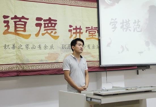 本期道德讲堂分为五个环节:唱歌曲、学典范、诵经典、发善心、送吉祥。在大家齐唱《公民道德歌》的歌声中,讲堂拉开序幕。道德短片《最美中国人》观后,现场学生们为最美新娘、最美妈妈、最美交警、最美农民工的感人行为和高尚思想境界深深感动。我院见义勇为英雄邢二朋同学作为最美大学生,为大家倾情讲述了自己在黄河中勇救3人的经过和自己的成长经历、人生感悟。讲述中,他救人过程中表现出的果敢、英勇、机智,救人后将1万元奖金资助母校更困难学生的决定以及在工地与母亲一起打工历经的艰辛、磨难等等,一次次激起全场雷鸣般的掌声,这掌声是赞赏、是感动,更是所有人内心深处最本真、最纯净部分的共鸣。最后,邢二朋说,希望大家都能在以后的日子里,把自己内心的真善美展现给身边的每一个人,展现给全社会。