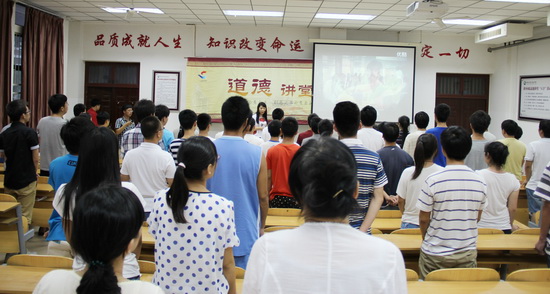 黄河水院道德讲堂由党委宣传部负责建设,思想政治理论教学部负责实施,学工部、团委共同参与。道德讲堂将每月开办一次,讲堂以加强社会公德、职业道德、家庭美德和个人品德建设为主要内容,以“身边人讲身边事,身边人讲自己事,身边事教身边人”为主要形式,按照“唱歌曲、学模范、诵经典、发善心、送吉祥”等五个基本程序,推行“唱一首歌曲,学一个模范,诵一段经典,讲一个故事,谈一番感悟,做一个承诺,学一点礼仪,送一份吉祥”的“八个一”流程,仪式规范肃穆,使广大学生通过道德讲堂自我熏陶、自我教育、自我提升,洗心静心,自觉做道德的传播者、践行者、受益者。