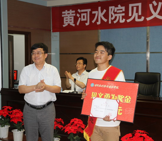 党委副书记、院长刘国际为邢二朋同学颁发了见义勇为奖金和“见义勇为道德模范”荣誉证书。