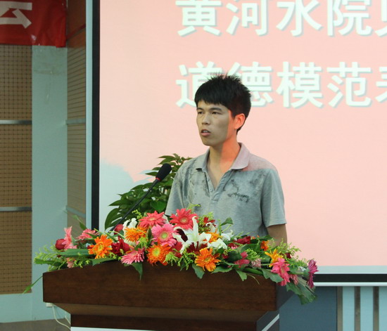 范斌辉同学代表学生发表感言。作为邢二朋的室友和同班的团支部书记,他说,邢二朋是一个自立自强的人。他9岁失去父亲,15岁开始利用寒暑假打工,家境贫寒,历经坎坷,却无法阻挡他对生活的热爱和人生的追求。邢二朋是一个踏实肯干的人。做为院社团联合部的一名干事,他踏实认真,深得师生好评;做为宿舍长,他任劳任怨,深得室友拥戴。邢二朋是一个有思想的人。他因经常在工地打工而喜欢上工程,因第一次坐火车而喜欢上铁路,因立志为家乡修建一条通往村头的公路而选择了黄河水院交通工程系。邢二朋是一个机智勇敢的人。短短7分钟,3次跳入黄河,救出3条鲜活的生命,实在勇气可嘉,而临危不乱更难能可贵。最后,他代表全院学生说,我们应该以邢二朋同学为榜样,学习他那种自立自强、踏实肯干的宝贵精神;学习他那种临危不惧、见义勇