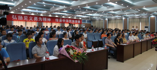 邢二朋同学讲述了自己的救人事迹。讲述中,他说,如果看到三个鲜活的生命在黄河里挣扎,我相信作为黄河水院人,作为“90后”的新一代,我们都是相同的:那就是奋不顾身跳进去把他们救出来!谈到自己为什么救人和救人后的感想,他说,第一,我9岁时便失去了父亲,我曾经因失去亲人痛彻心扉,所以我不能让悲剧重演,而当时在黄河里挣扎的是三条人命,如果我当时不去救的话,我感觉对不起自己的良心。第二,我们从小到大接受中华民族见义勇为传统美德教育,尤其是来到黄河水院以后,通过参加思想教育、社会实践活动和身边榜样的影响,使自己的思想得到了升华,我和在座的黄河水院人一样:事情是偶然的,行为是必然的!第三,我之所以能够成功救上三人并能确保自身安全,我感觉有四方面原因:一是精神,二是幸运,三是理智,四是技能。见义勇为的精神我们每个人都有;幸运不是每次都能碰到;理智需要我们时刻保持;技能需要一生铸就!希望大家,当然也包括我,能够怀揣一种精神,理性看待当前形势,练就一身过硬技能,成就一番辉煌成就!最后,他充满感激地说,感谢学院为我颁发的一万元奖金,但是通过学院的资助、自己勤工助学和寒暑假打工,我完全可以自食其力,我决定把这一万元捐给社会上更需要的人。顿时,会场掌声雷动。