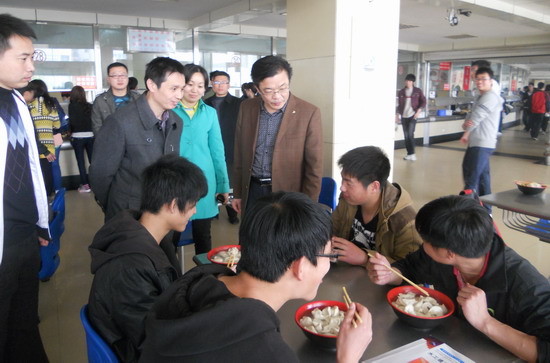 4月8日中午,院党委副书记刘卫锋在学生处处长朱焕立、团委书记谷献晖、学生处副处长王国英、后勤服务中心副主任任璐等的陪同下,对我院广大学生文明用餐、节约用餐情况及学生食堂的卫生、安全、饭菜价格和种类状况进行了详细的走访调研,并对“光盘行动”、“文明就餐”等活动的开展提出具体要求。
