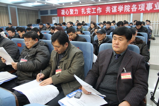 大会开幕式共有五项议程:院长刘国际作《院长工作报告》,纪委书记、工会主席张豫东作《工会工作报告》,计划财务处处长王景顺作《学院财务工作报告》,首届工会经费审查委员会主任彭新立作《工会经费收支情况报告》,对院领导班子和领导班子成员、全体中层干部进行民主评议。