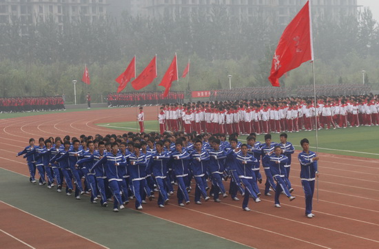 阅兵仪式前,在学生处的组织下,9月20日,我院在祥云体育场举行了2012级新生军训会操。学生处处长朱焕立、驻汴某部领导及各系分管学生工作领导共同观看了会操。会操评比是一次增加凝聚力及团结精神的机会,16个方队着装统一、口号宏亮,动作标准、规范,整齐划一,以最佳的风貌投入到会操评比中。最终,由3名部队官兵和我院4名教师组成的评委,从队伍的精神风貌、整齐程度、动作规范等方面对各方队进行了评比。