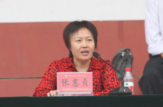 党委书记张惠贞作了军训总结讲话。她首先代表院党委、院行政向承担这次军训任务的驻汴某部的官兵们表示衷心的感谢和崇高的敬意,向出色完成军训任务的全体新生致以诚挚的慰问。张书记说,通过为期13天严格、系统的军事训练,广大新生不仅学习了军事常识,增强了国防观念、竞争与合作意识,而且培养了艰苦奋斗、勇敢顽强的军人作风,更加坚定了同学们的爱国主义信念,这必将对同学们的人生奋斗历程产生重大而深远的影响。希望同学们以这次训练为契机,将军训中表现出的坚忍不拔的精神、顽强奋斗的作风、勇往直前的气概和团结互助的精神,投入到以后的学习和生活中去,以良好心态去接受人生的挑战,奋发学习,挑起建设祖国的重担。