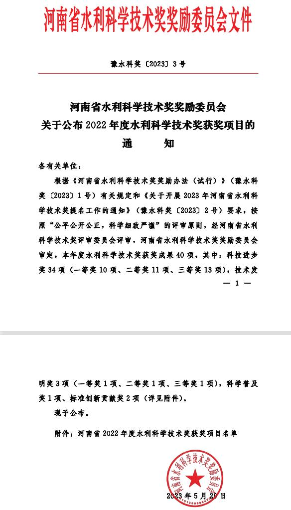 近日,河南省水利科学技术奖奖励委员会发布《关于公布2022年度水利科学技术奖获奖项目的通知》(豫水科奖〔2023〕3号),我校环境工程学院、河南省黄河中下游水资源节约集约利用工程技术中心负责人冯峰教授带领团队主持申报的《基于“四水同治”视域的开封市海绵城市建设关键技术》、与河南省豫东水利管理局联合申报的《基于耗水因子识别和完备度分值的引黄灌区真实耗水量分析》均荣获二等奖,此两项获奖项目也被推荐参加河南省科技进步奖的评选。