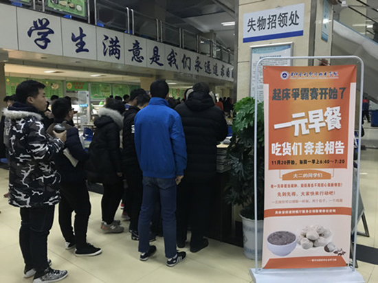 学风建设活动同时还包括“学霸一元吃早餐”奖励活动,以鼓励学生们坚持早起,勤奋学习。自今年11月20日起,每周一早上6:40-7:20,校学生会学习部在学校餐厅43号窗口开展“学霸一元早餐”活动,每周一的前100名用餐学生只需要使用1元钱即可得到4元的早餐。在即将进入的学习月中,校学生会将开展“135”早餐活动,即每周一、三、五,都将为前50名用餐学生提供一元早餐。(供图:团委)