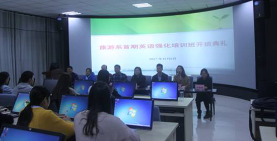 提高学生英语口语水平,进一步提升职业竞争力11月6日晚,旅游系在SY5102教室举行首期英语强化培训班开班典礼。国际教育学院院长陶永霞,旅游系主任焦红强、党总支书记樊建科部分专业教师及旅游系2016级酒店管理专业、旅游管理专业的34名优秀学生参加了此次活动。