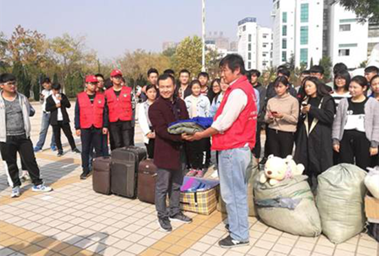 近日,我校诚信自强联合会联合“开封市志愿者协会”开展向贫困山区捐赠过冬衣服活动。捐赠仪式在我校举行,“衣往情深  捐资助人”志愿者协会开封区负责人接收了我校所捐衣物。