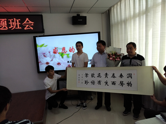 水利工程学院水工1603班学生谭成杰代表全家向水利工程学院赠送写有“润物无声春雨贵 失花有致绿叶珍”的书法作品,表达对学校、老师和同学的感激之情。他说:“我感恩老师、同学和家人对我做的一切,在今后的生活中,我会照顾好自己,让老师、同学、家人放心,这就是对爱我的人的最好的感恩与报答。遭遇车祸,我是不幸的,同时我也是幸运的,因为我选择了黄河水院,遇到了这么多有爱的老师和同学。”