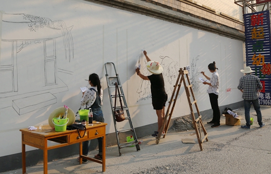 活动中,志愿者们以社会主义核心价值观、传统美德、城市新貌等内容,对吕庄新村200多米的老墙进行了手绘改造。师生志愿者冒着酷暑,定点、打稿、上色、整体调整,各个步骤有条不紊,一气呵成,很快,原本光秃秃的墙面就穿上了“新衣”。老墙的新装饰在一定程度上改善了社区人们的居住环境,同时也为社区增添了一道亮丽的风景线。活动过程中,路过的居民纷纷对本次活动表示赞许。