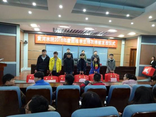 为使我校家庭经济特殊困难的大一新生能够度过一个温暖的冬天,12月12日,我校学生资助管理中心在3号实训馆学术报告厅举行爱心棉衣棉被发放仪式,将学校购置的100余件棉衣、棉被免费发放到学生手中。学生处副处长霍卫红、学生资助管理中心老师董新法、陈思以及诚信自强联合会成员和受助学生参加了活动。
