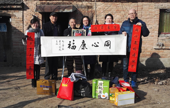社员们怀揣着一颗颗暖暖的心,精心准备串亲戚的礼品。老社员李学翔老师早早地就准备好两大袋冬衣和蛋白粉。社员陈豫老师提早一周邀请她的一位精通书法的朋友写了一幅字“同心康福”和几幅春联,其中一幅是“同心康福缔纽带,九三农户一家亲”,横幅“常来常往”。社员赵秋霞老师说:“这个中山装的外套我买了两件,一件给我父亲,一件给牛师傅带去,该过年了,老人也得穿个新衣服嘛。”社员杨立功老师上次去牛师傅家发现他的拐杖不合适,找了一副得劲拐杖,并把自己定做的保暖内衣也送给了牛师傅。社员们还带去了大米、食用油、山药、火腿肠、鸭蛋、黄桃罐头、面粉等年货。