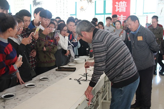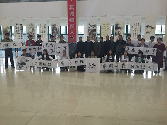 本次活动展出的书画作品近50幅,有栩栩如生的牡丹、活灵活现的梅花、生机勃勃的山水画,还有生龙活虎的楷书、坚韧有力的隶书、古色古香的篆书等作品。一幅幅书画佳作深深地吸引学生们驻足观看,大家时而交换心得,时而拍照留念。书画展出过程中,出席活动的书画家现场为大家挥洒笔墨,学生们备受感染,纷纷在宣纸上留下笔墨,展示才艺。