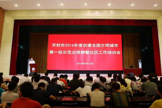 8月16日上午,开封市2016年度创建全国文明城市第一批示范点授牌暨社区工作培训会在我校召开。市委宣传部副部长、市文明办主任何利军及相关部门负责人出席了会议,市各办事处、社区主任参加了会议。会议由市文明办副主任李波主持。