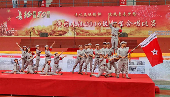 水利工程学院代表队演唱的《永世不忘》,带领广大师生追忆红军长征的光辉历程,歌颂了祖国从一个辉煌走向另一个辉煌的发展历程。
