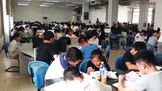 “临时自习室”有 500多平米,室内整齐摆放着26张电脑桌,可容纳200名学生学习。学生只需刷卡进入,没有时间限制,里面还有矿泉水,凉爽宜人的自习室,满满的都是学生刻苦学习的身影。(供稿:图书馆 李良玉)
