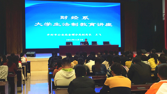113日下午,在学生活动中心报告厅,我校财经系特邀开封市公安局金耀分局副局长王飞为学生们做了一场大学生法制教育专题讲座。该系党总支书记杜广平、副书记胡晓慧、部分师生及30余名干警参加了报告会。