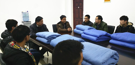 座谈会上,叶建海对学生在学校住宿紧张的情况下,主动向新生让出床位、为学校排忧解难的行为极力表扬;表示学院会竭尽全力帮助学生们安全、顺利地度过寒冬;并要求学生安全用电,为学校做出贡献的同时不能忽略安全问题。楚万强详细询问学生们在“连廊”住宿的情况,感谢学生们体谅学校,积极配合学校工作。最后,该院领导及老师向在座学生赠送了保暖被褥。
