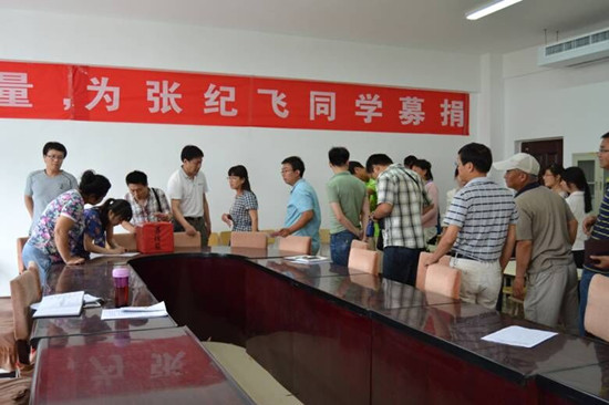 6月9日下午15:00,机电工程系“凝聚爱心,为张纪飞捐款”活动在SY5211会议室举行。活动中,该系党总支副书记胡晓慧为大家详细介绍了张纪飞同学病情及家庭状况;系主任胡修池号召全系师生奉献爱心,用实际行动挽救这名风华正茂的大学生的生命。在捐款现场,气氛凝重,没有更多的语言,大家内心深处只有一个共同的愿望:希望张纪飞同学早日康复。捐款有限情无疆,5元、10元、20元、50元、100元……,不同的捐款数额却凝聚着同样的深情厚谊。截至下午16:20,本次活动机电工程系共筹集捐款3万多元。