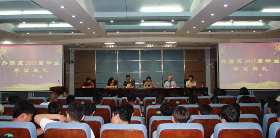 69晚,外语系2015届学生毕业典礼在3号实训馆学术报告厅隆重举行。副校长刘紫婷、澳大利亚沃东加职业技术学院代表Ian博士、外语系党总支书记关六三及系主任王爱琴、副主任王成伟等出席典礼,该系各教研室主任、部分任课教师、学工人员及全体毕业生参加典礼。活动由该系分团委书记郝黎闻主持。