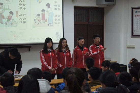 由该系音乐表演专业1401班刘鹏宇同学演唱的歌曲《时间都去哪儿了》拉开了本次活动的序幕。“诵经典”环节中,2014级学生代表吟诵了《弟子规》;《跪羊图》记录短片,“慈鸦尚还哺,羔羊犹跪足”使师生深刻感悟孝顺父母的传统美德。“讲故事”环节将活动推向高潮,由2014级环艺专业的田鹏军同学讲述了学生们去敬老院看望老人的经过和感悟,用自己及身边人的事迹营造“积小善为大善,积小德为大德”的良好风气。“学礼仪”环节中,该系礼仪队通过现场提示和动作示范,将握手、站姿、坐姿等礼仪形象进行了展示,让师生受益匪浅。