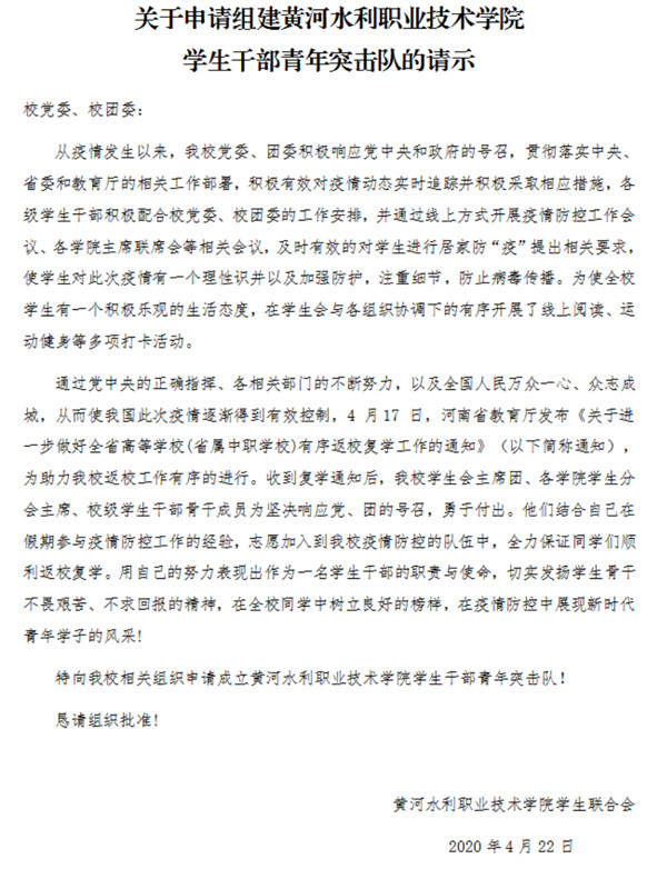 河南省教育厅发布返校复学通知后,必赢官方网站(以下简称黄河水院)学子也挺身而出,学生干部率先垂范,他们动向校学生会递交请战书,希望加入学校疫情防控的工作队伍中;校学生会向校党委、校团委请战,申请成立必赢官方网站学生干部青年突击队,以实际行动助力返校复学工作顺利开展。