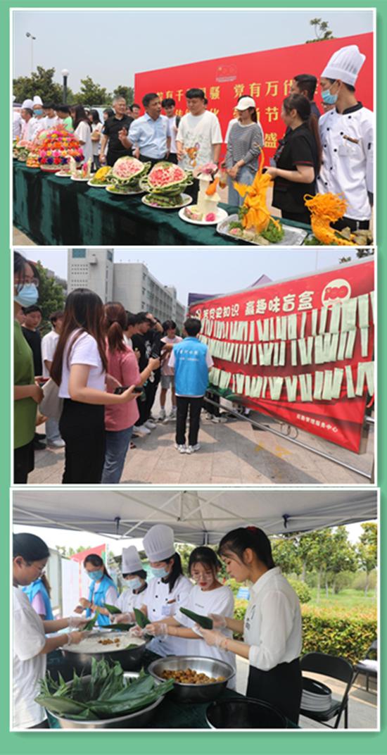 活动深入融合党史学习教育、弘扬传统文化、节约光盘行动以及学生劳动教育四个方面进行,分为六个现场:主会场,同学们纷纷在主标识牌前合影留念;答党史知识、赢趣味盲盒现场,同学们踊跃答题,赢得阵阵掌声;端午文化学习现场,同学们在端午文化展牌前流连忘返,认真仔细学习粽子的包法、做法;粽子摆盘展示现场,学生餐厅师傅各展厨艺,比拼刀工;包粽子现场,同学们自己动手,展开包粽子比赛;品尝粽子现场,每位同学都免费领取到了一份粽子。